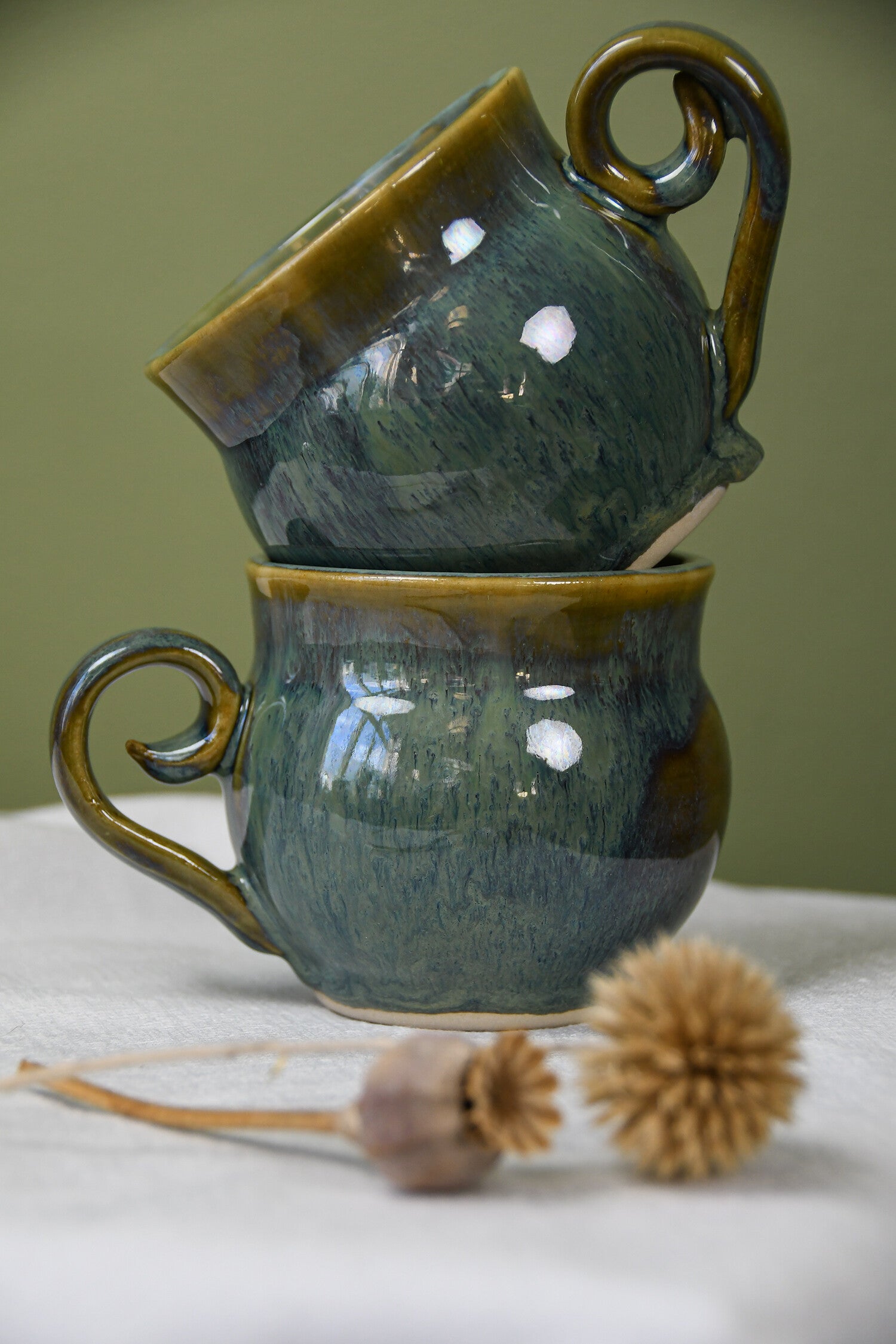 Deze royale mok is niet alleen ideaal voor je koffie of thee, maar voelt als een kunstwerk in je hand. De prachtig vloeiende glazuren geven de mok een mystieke uitstraling waar je eindeloos naar kunt kijken.
